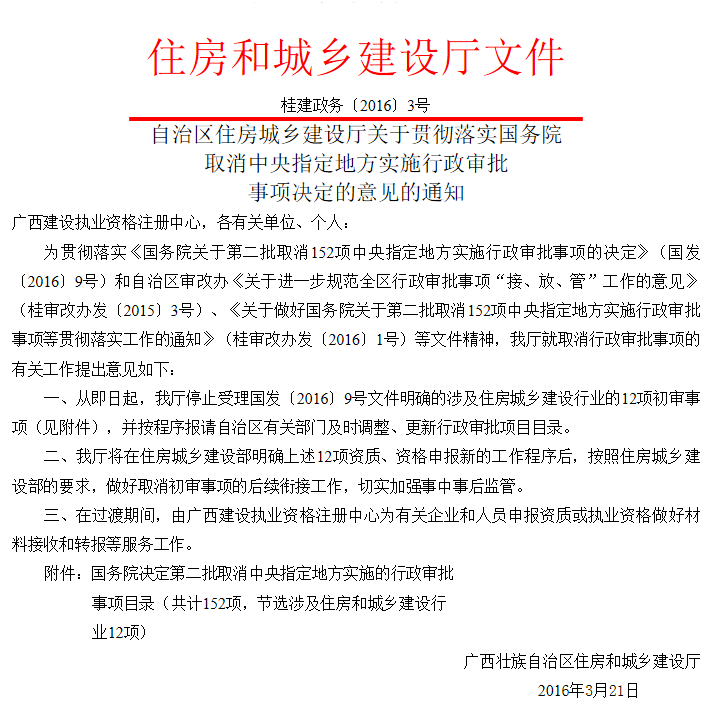 • 自治區(qū)住房城鄉(xiāng)建設(shè)廳關(guān)于貫徹落實(shí)國(guó)務(wù)院取消中央指定地方實(shí)施行政審批事項(xiàng)決定的意見的通知(桂建政務(wù)〔2016〕3號(hào))